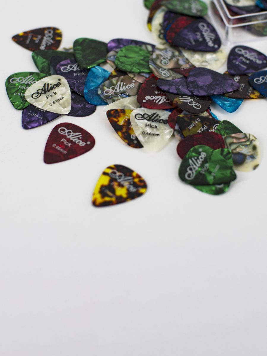 Alice AP-100A Медиаторы, целлулоид, разноцветные, толщина 0,46-0,81, набор из 100шт