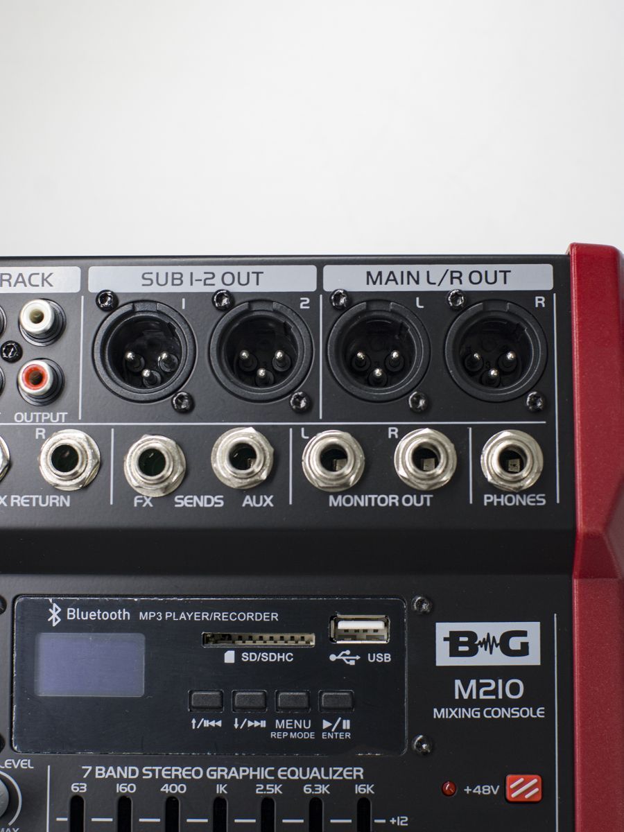 BG M210 Пульт микшерный, 8 моно, 2 стерео, USB/SD MP3 плеер, процессор эффектов, 7 полосный эквалайзер, 2 подгруппы, фантомное питание